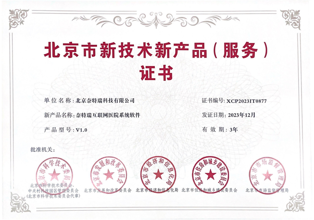 近日,北京市科学技术委员会、北京市发展和改革委员会、北京市经济和信息化局、北京市住房和城乡建设委员会、北京市市场监督管理局联合发布通知,公示第十九批北京市新技术新产品(服务)名单。奈特瑞NetRain自主研发产品“奈特瑞互联网医院系统软件”顺利通过了认定,获得新产品项目类认定证书。此项荣誉,是对奈特瑞NetRain核心产品的技术创新性、先进性的充分肯定。